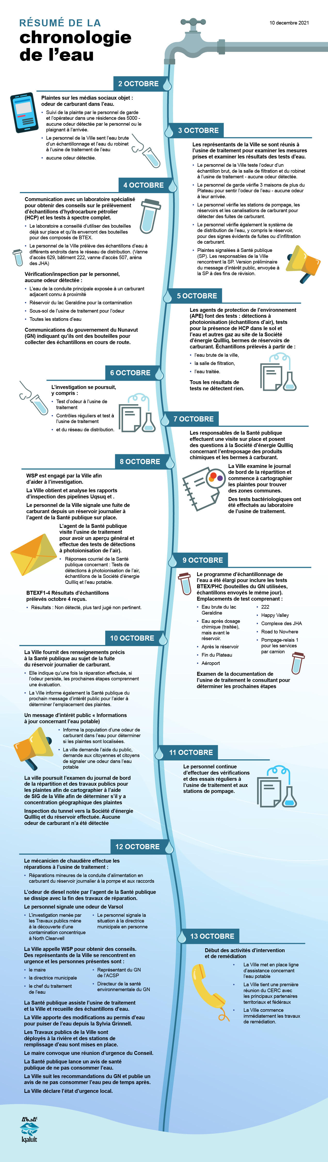 La Ville d’Iqaluit garde toujours en vigueur l’avis de ne pas consommer l’eau, car elle attend la publication des résultats des tests du gouvernement du Nunavut. Tous les tests effectués par la Ville d’Iqaluit indiquent que la qualité de l’eau est conforme aux taux admissibles des Recommandations pour la qualité de l’eau potable du Canada, sinon même meilleure.