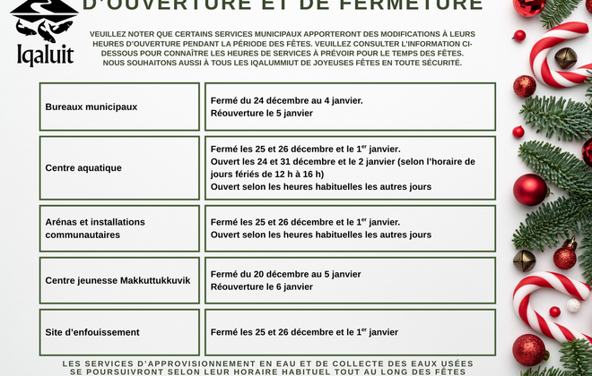 Des heures d’ouverture modifiées et des fermetures sont à prévoir pour les différents services municipaux pendant la période des Fêtes.