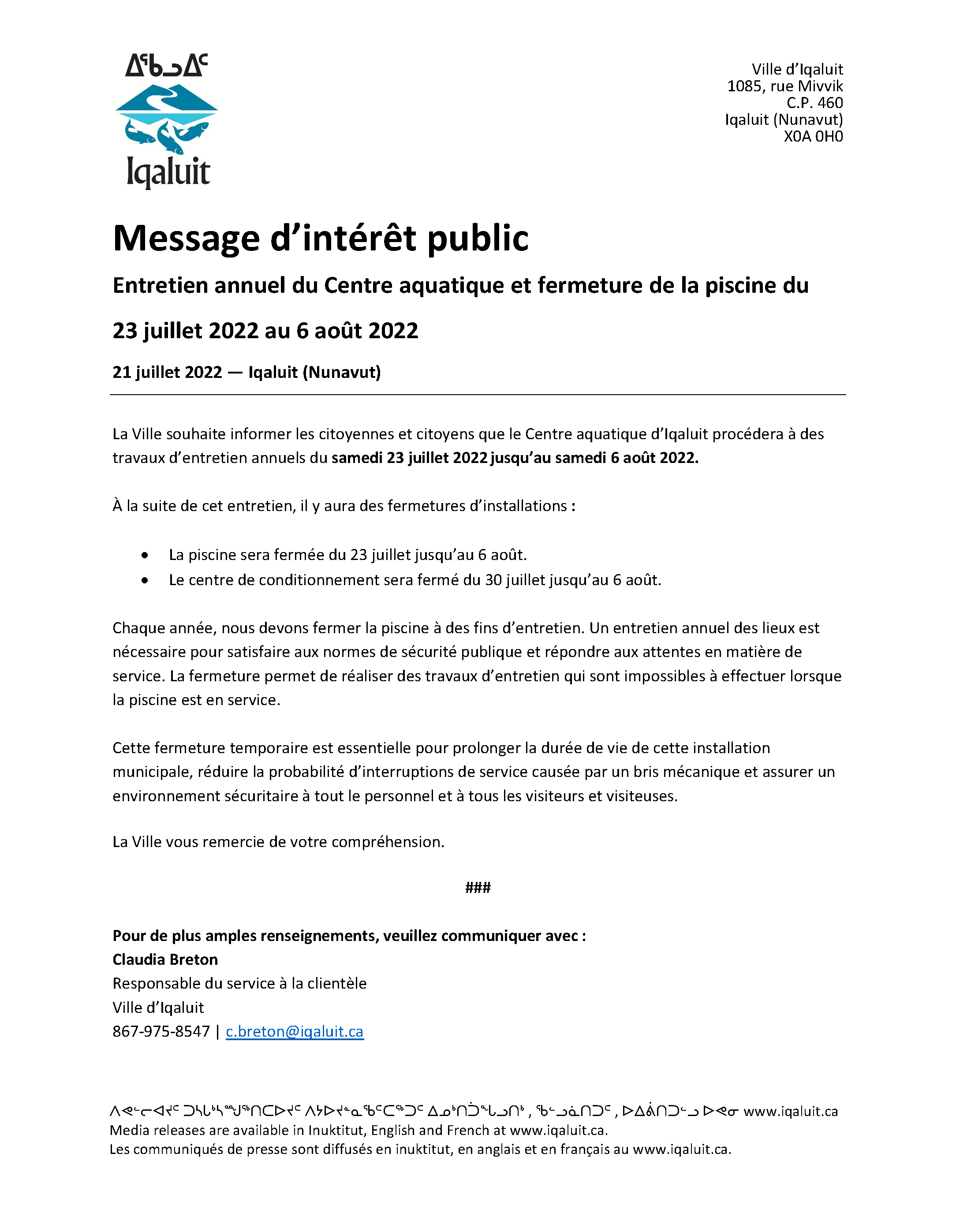 La Ville souhaite informer les citoyennes et citoyens que le Centre aquatique d’Iqaluit procédera à des travaux d’entretien annuels du samedi 23 juillet 2022 jusqu’au samedi 6 août 2022.