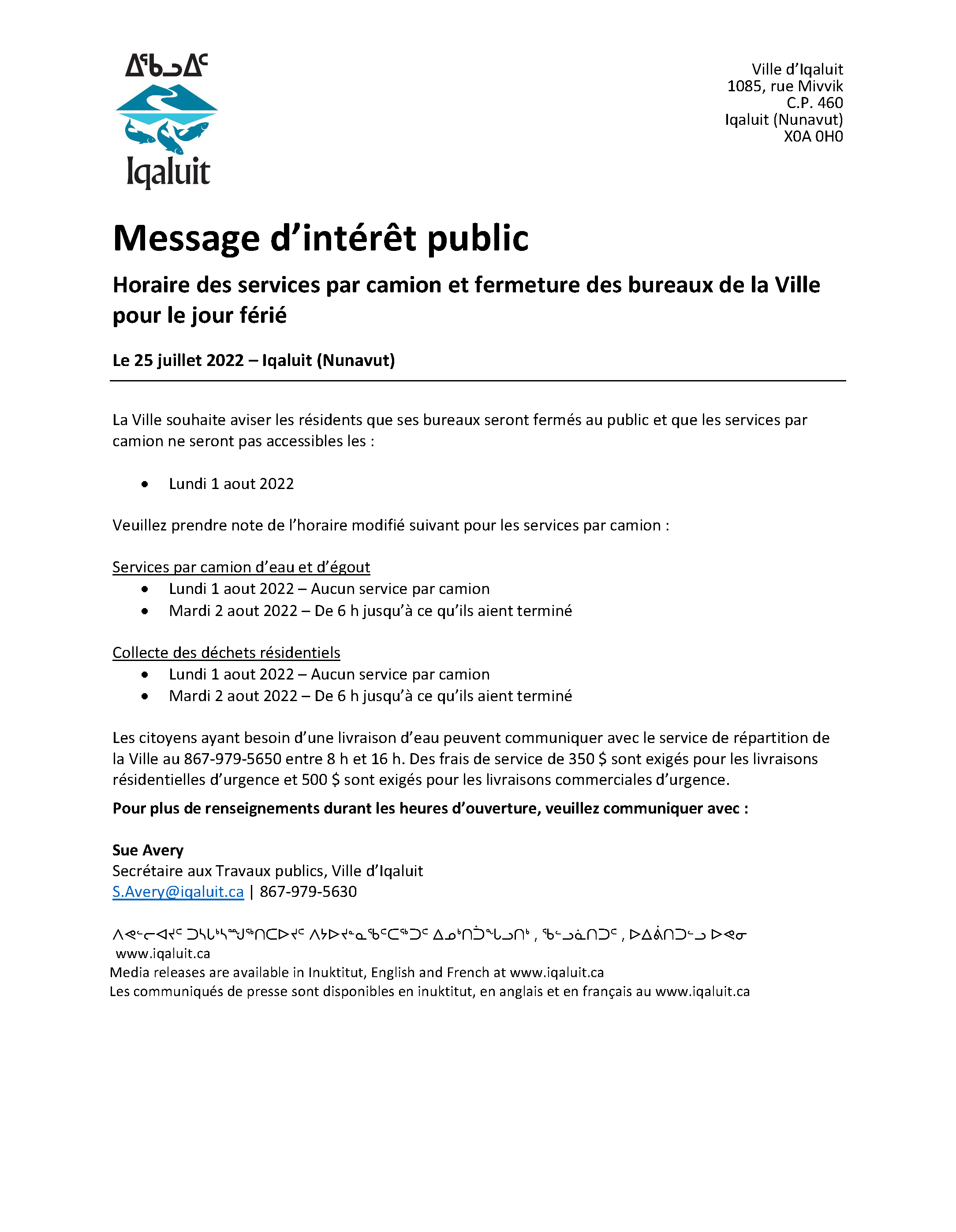 Media releases are available in Inuktitut, English and French at www.iqaluit.ca Les communiqués de presse sont disponibles en inuktitut, en anglais et en français au www.iqaluit.ca