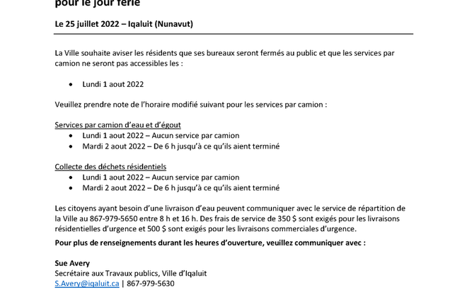 La Ville souhaite aviser les résidents que ses bureaux seront fermés au public et que les services par camion ne seront pas accessibles les :