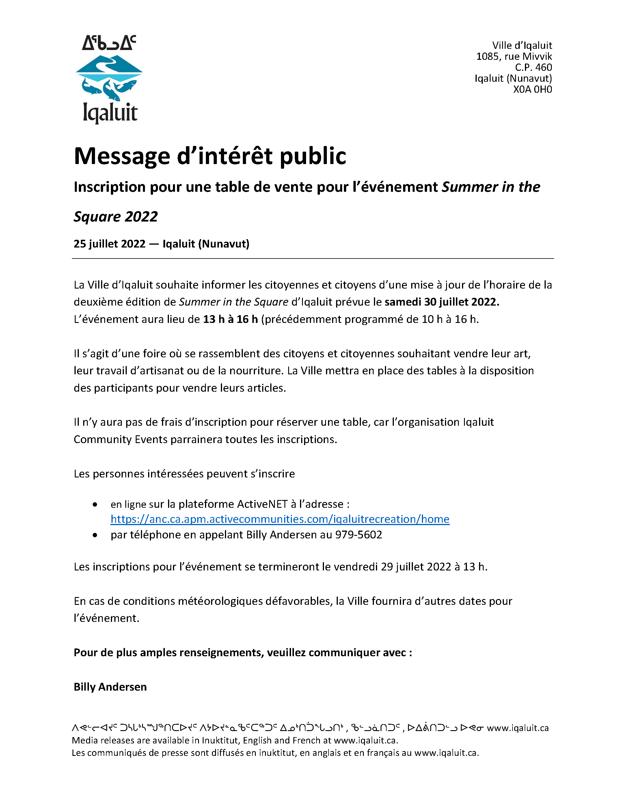 La Ville d’Iqaluit souhaite informer les citoyennes et citoyens d’une mise à jour de l’horaire de la deuxième édition de Summer in the Square d’Iqaluit prévue le samedi 30 juillet 2022. L’événement aura lieu de 13 h à 16 h (précédemment programmé de 10 h à 16 h.