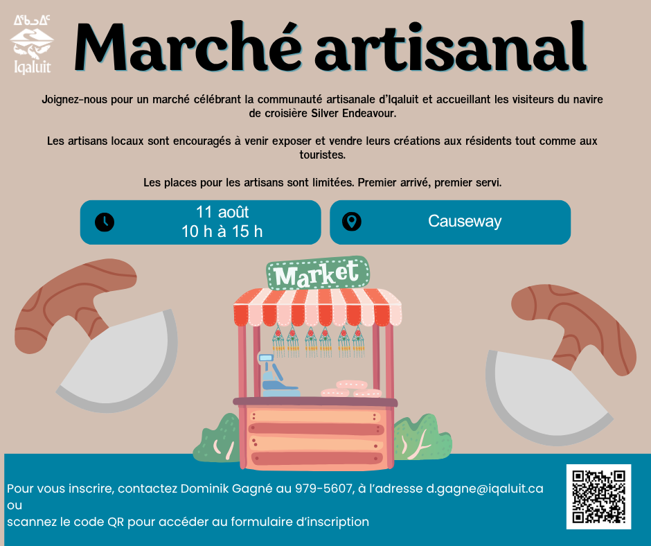 La Ville d’Iqaluit invite avec plaisir les artisans et les entrepreneurs de la région à participer à un marché d’un jour au quai, le lundi 11 août, de 11 h à 15 h.