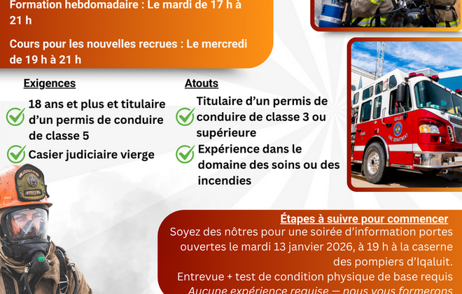 Soyez des nôtres pour une soirée d’information portes ouvertes le mardi 13 janvier 2026, à 19 h à la caserne des pompiers d’Iqaluit.
