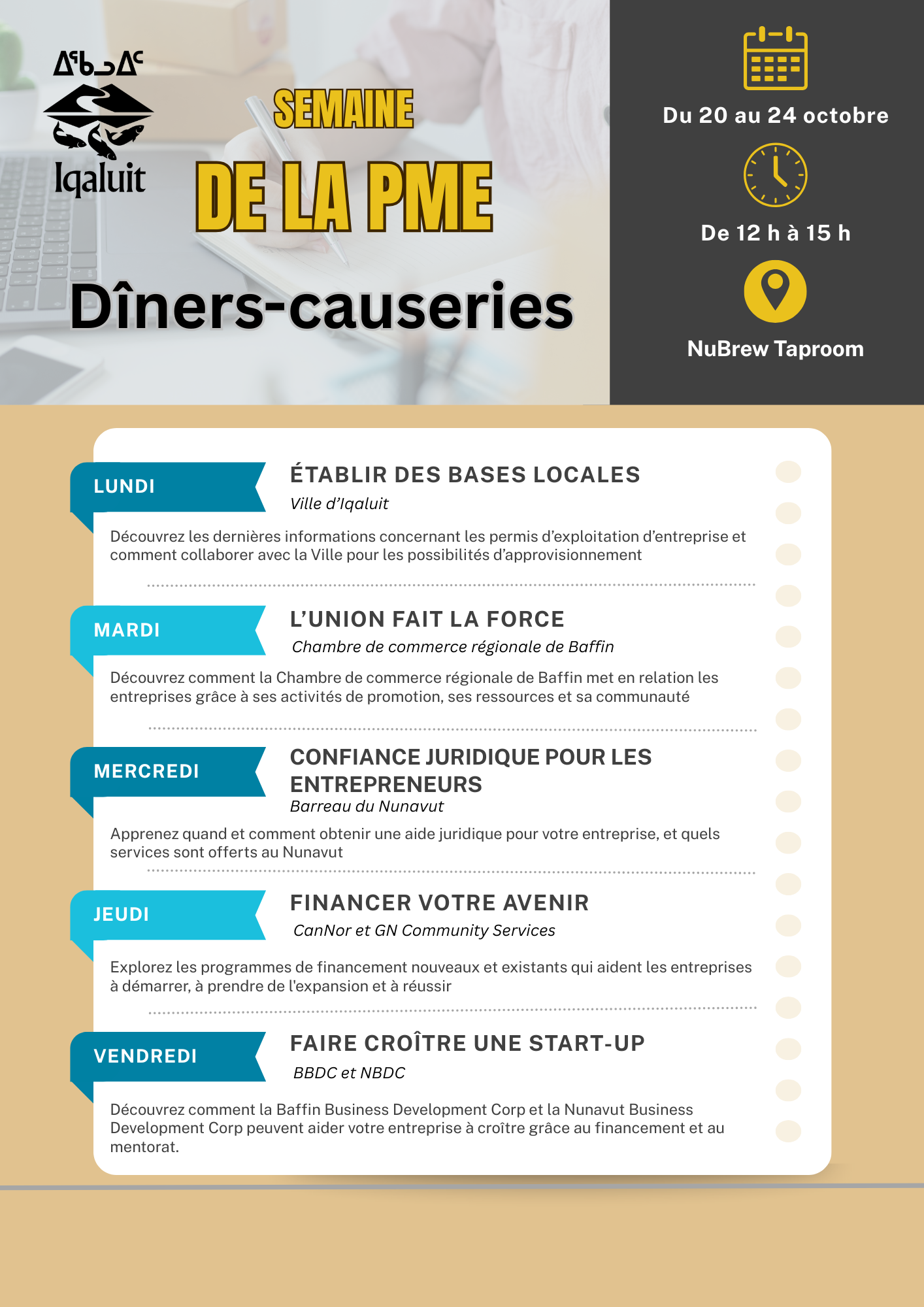 La Ville d’Iqaluit invite les entrepreneurs locaux à participer à une série de dîners-causeries à l’intention des PME , une initiative gratuite d’une semaine conçue pour renforcer et soutenir notre communauté d’affaires.