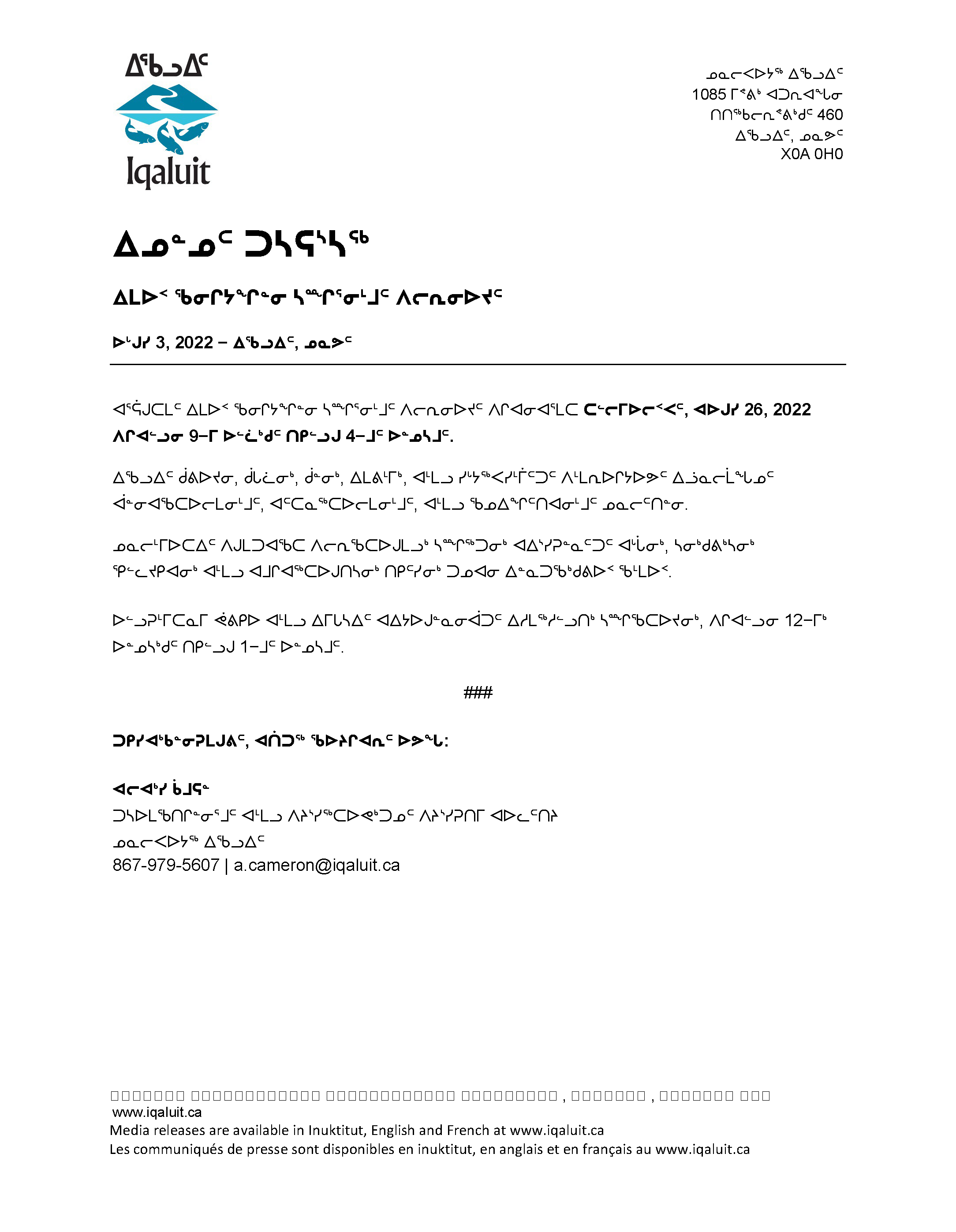 ᐊᕐᕌᒍᑕᒪᑦ ᐃᒪᐅᑉ ᖃᓂᒋᔭᖏᓐᓂ ᓴᙱᕐᓂᒻᒧᑦ ᐱᓕᕆᓂᐅᔪᑦ ᐱᒋᐊᓂᐊᕐᒪᑕ ᑕᓪᓕᒥᐅᓕᑉᐸᑦ, ᐊᐅᒍᓯ 26, 2022 ᐱᒋᐊᓪᓗᓂ 9−ᒥ ᐅᓪᓛᒃᑯᑦ ᑎᑭᓪᓗᒍ 4−ᒧᑦ ᐅᓐᓄᓴᒧᑦ.