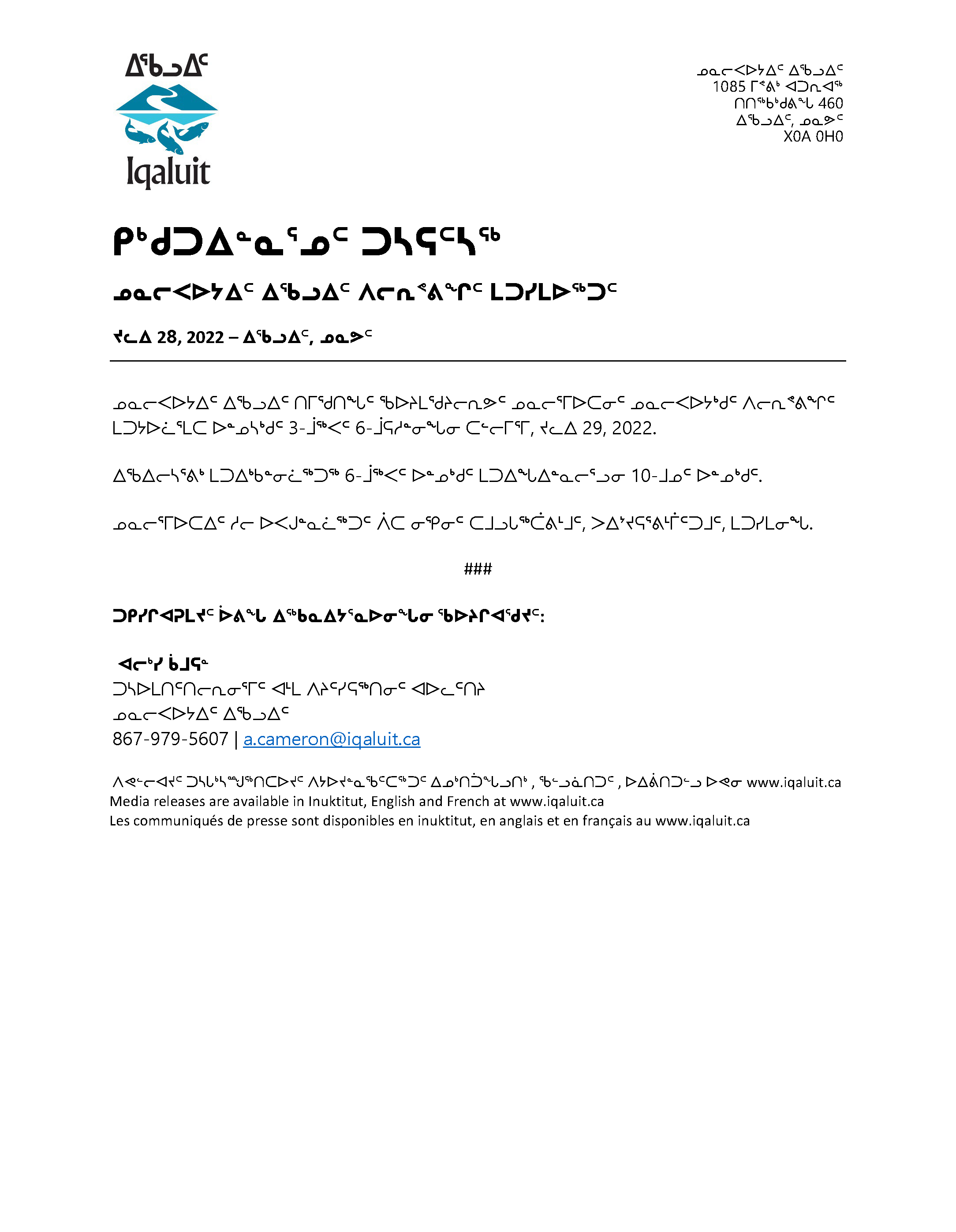 Media releases are available in Inuktitut, English and French at www.iqaluit.ca Les communiqués de presse sont disponibles en inuktitut, en anglais et en français au www.iqaluit.ca