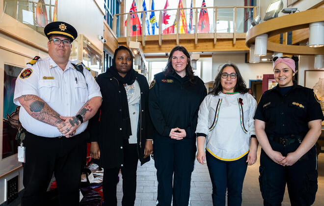 Photo information: Iqaluit’s Firefighters honoured International Women’s Day on March 8th by having an on call team made up entirely of women. On May 31st, they in turn were honoured by Iqaluit-Sinaa MLA Janet Brewster at the Nunavut Legislative Assembly. From left are: Iqaluit Fire Chief Steven McGean, Emergency Dispatcher Mam Osmani, Iqaluit Firefighter and Medic Amelia Martin, Iqaluit-Sinaa MLA Janet Brewster and Iqaluit Firefighter and Medic Emily Galipo. (Mac Paiva/City of Iqaluit Photo).