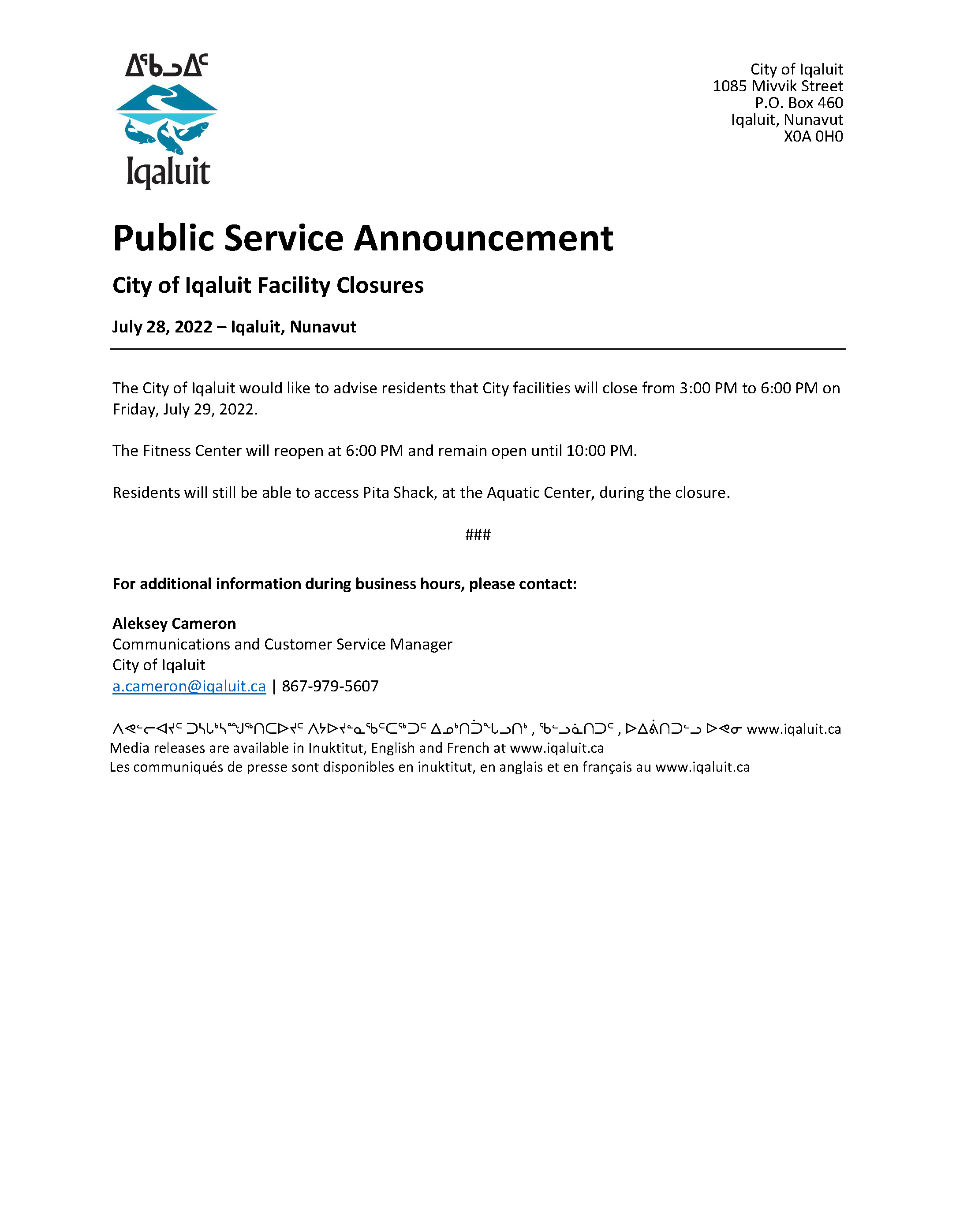 The City of Iqaluit would like to advise residents that City facilities will close from 3:00 PM to 6:00 PM on Friday, July 29, 2022.