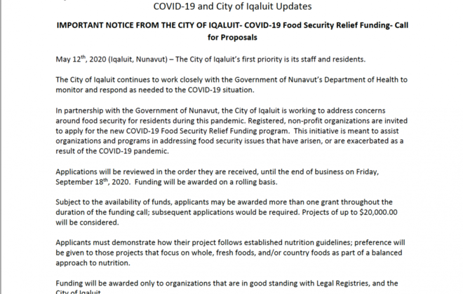 In partnership with the Government of Nunavut, the City of Iqaluit is working to address concerns around food security for residents during this pandemic. Registered, non-profit organizations are invited to apply for the new COVID-19 Food Security Relief Funding program.  This initiative is meant to assist organizations and programs in addressing food security issues that have arisen, or are exacerbated as a result of the COVID-19 pandemic.