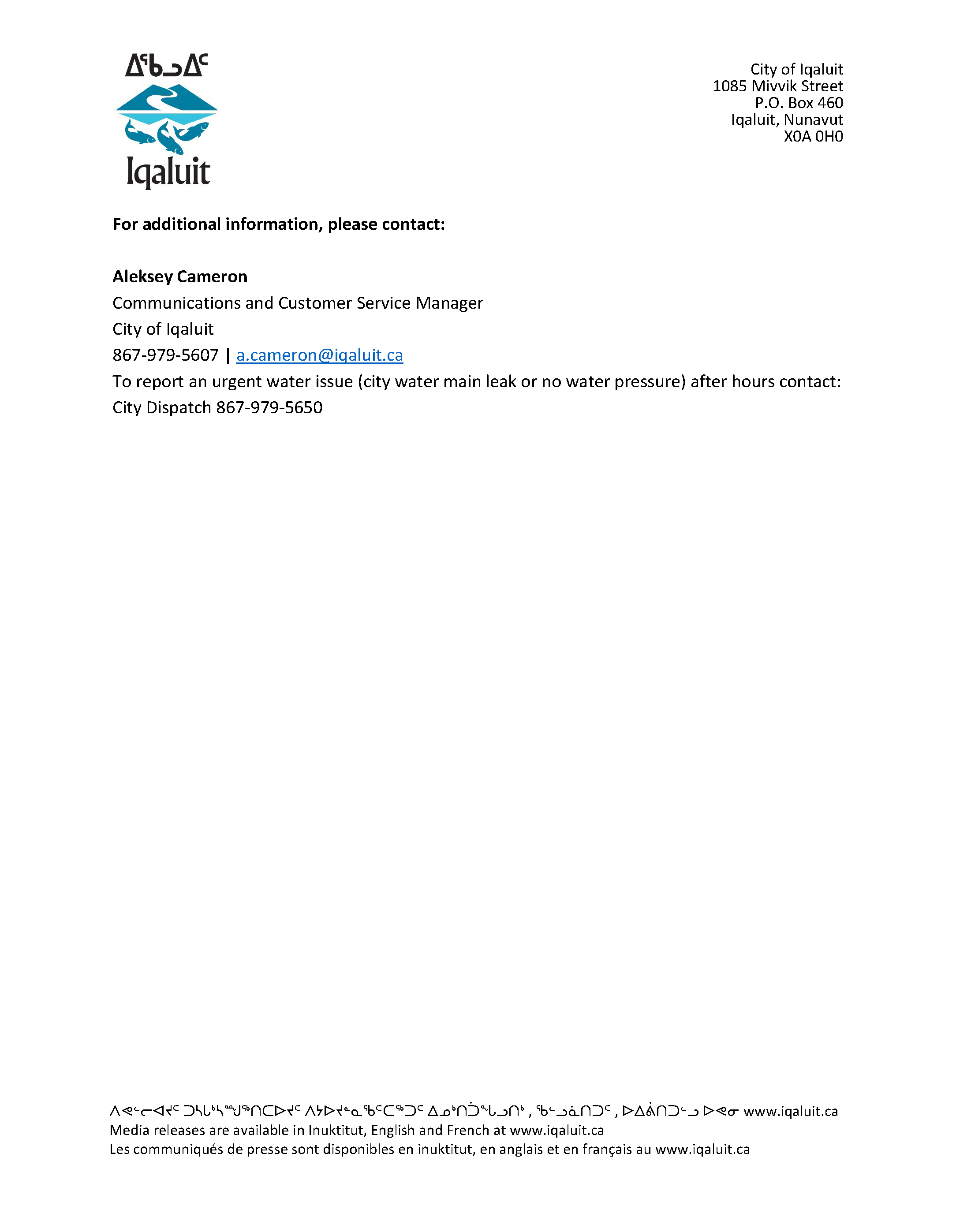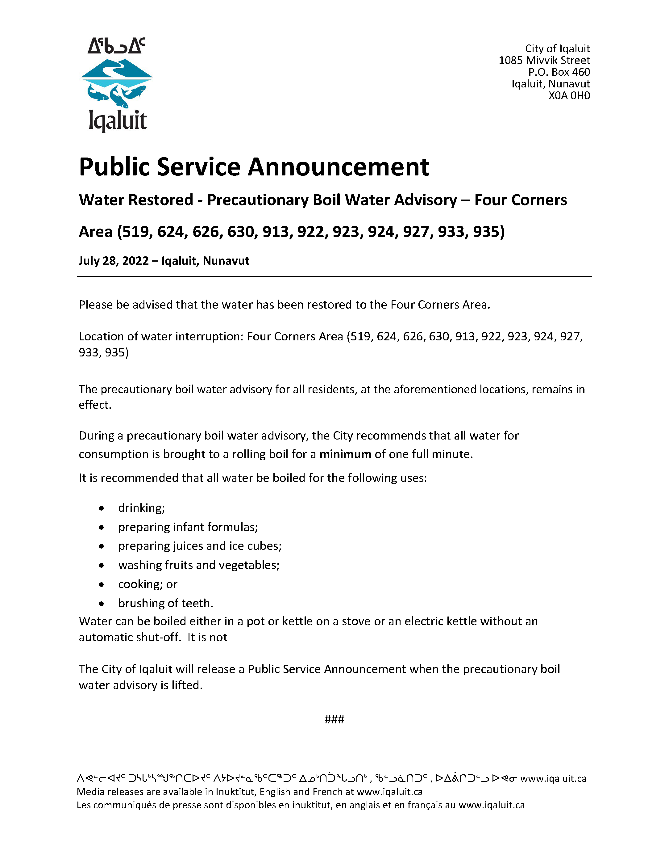 The City of Iqaluit will release a Public Service Announcement when the precautionary boil water advisory is lifted.