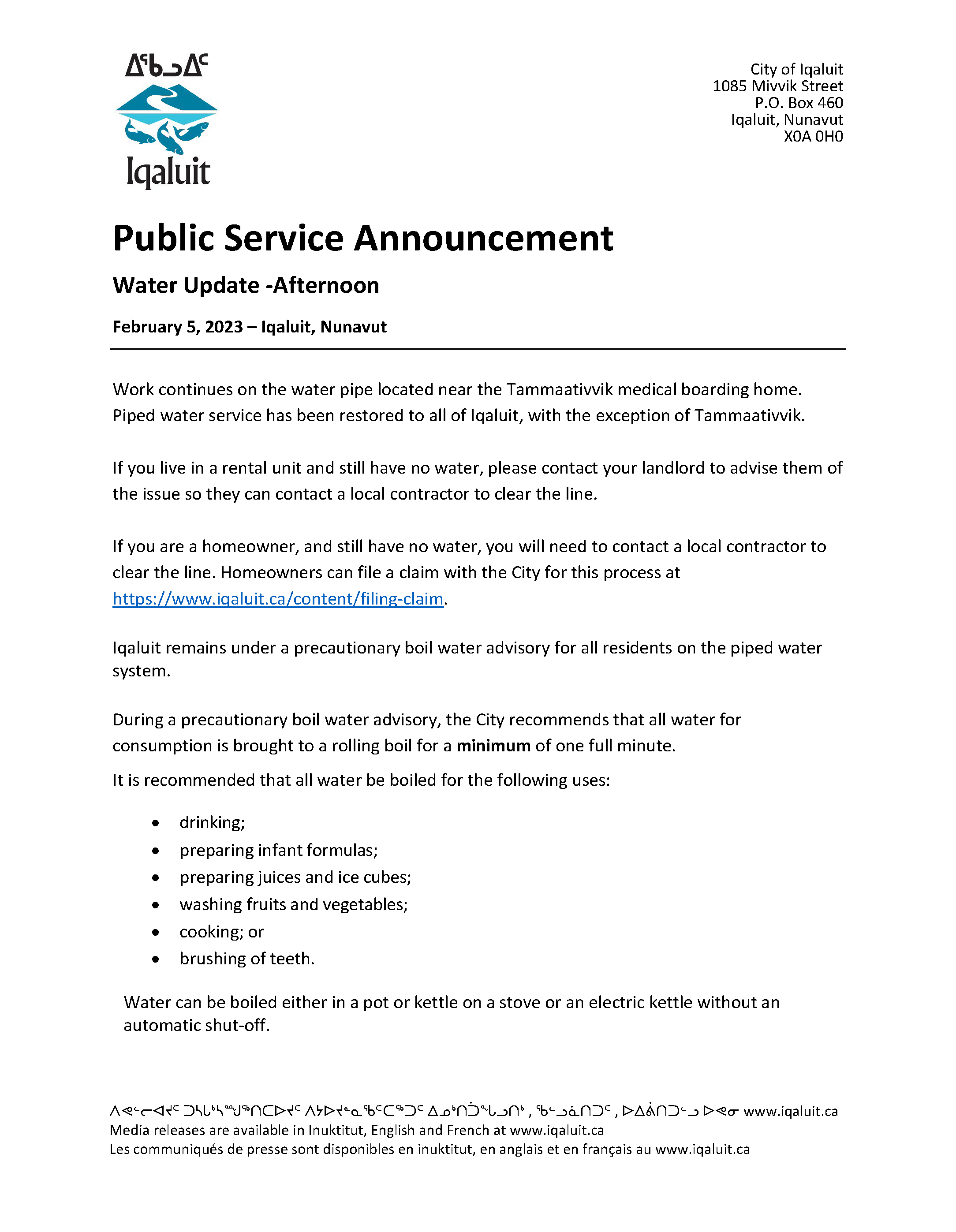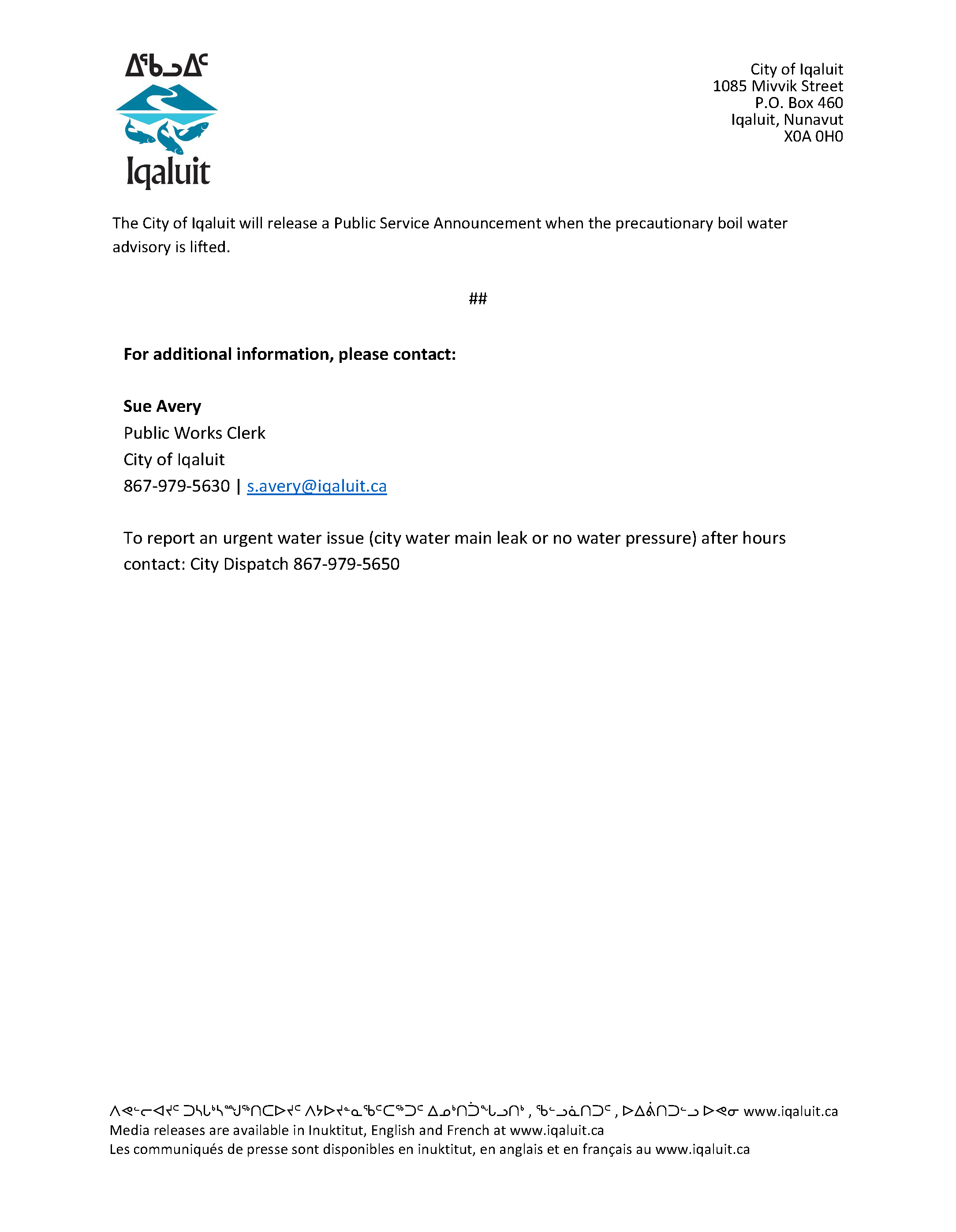 The City of Iqaluit will release a Public Service Announcement when the precautionary boil water advisory is lifted.