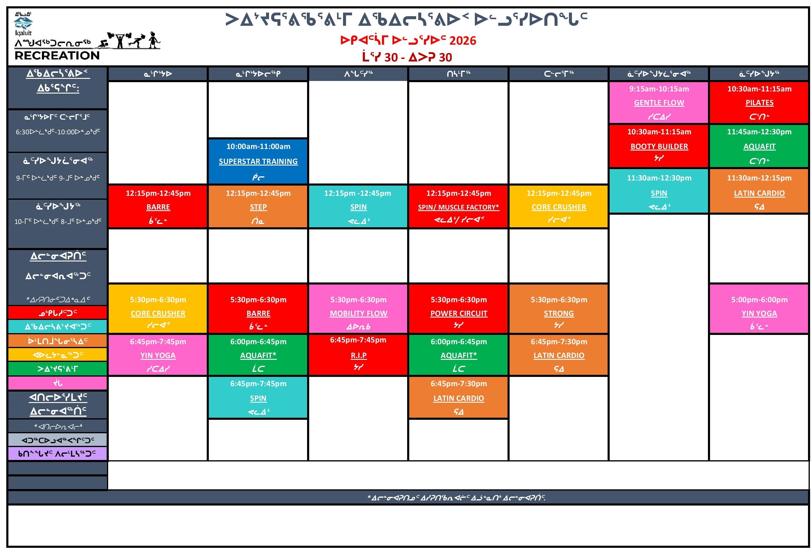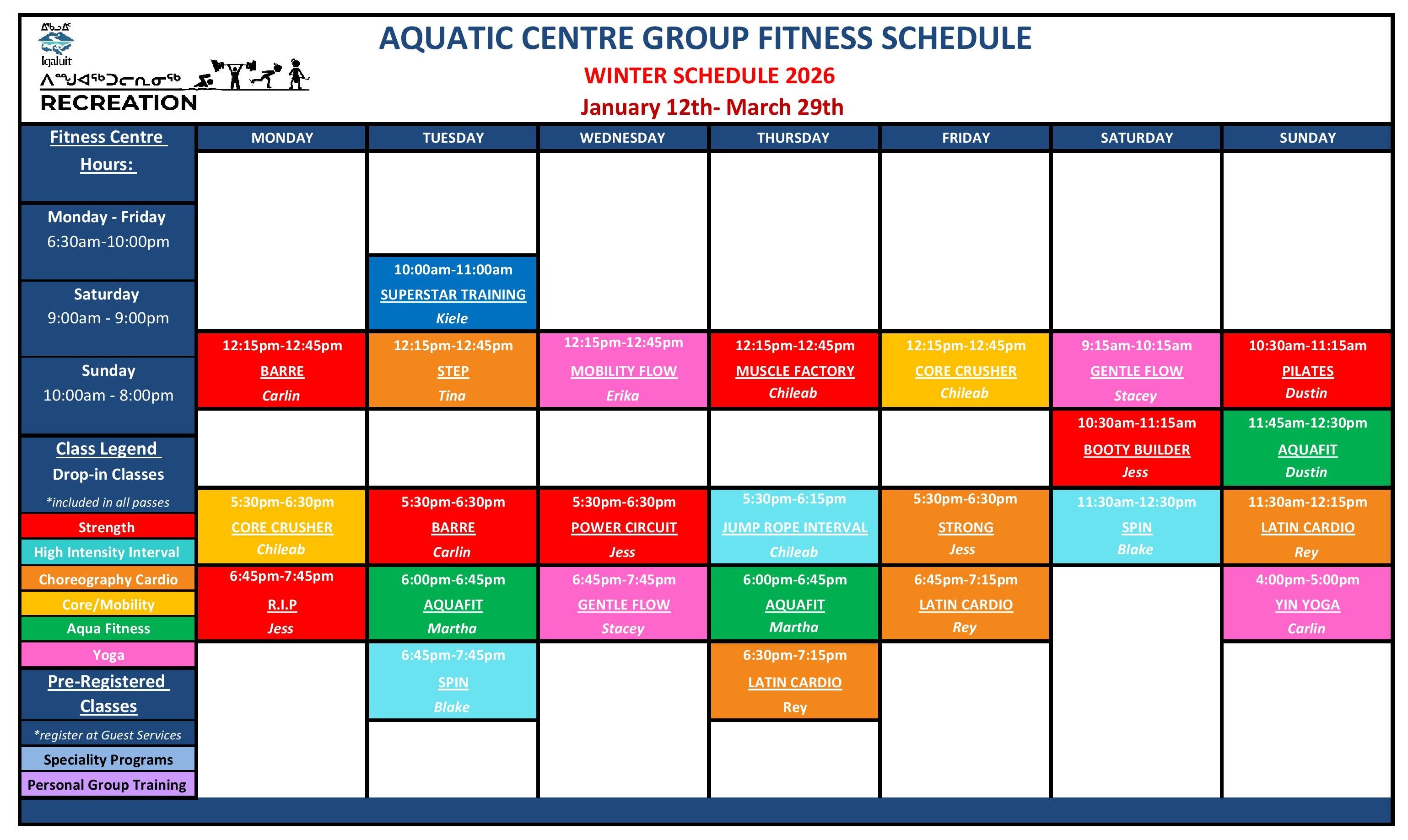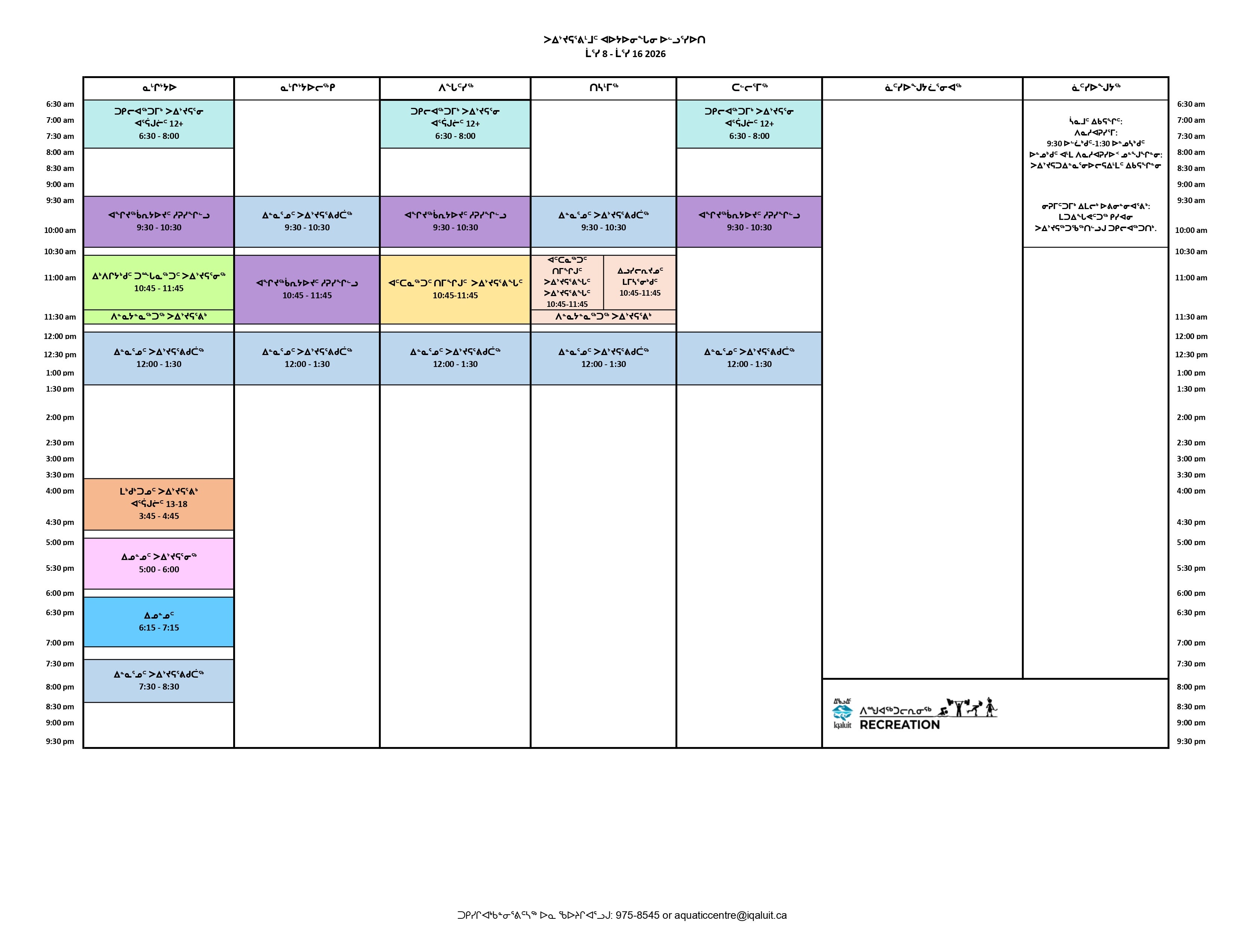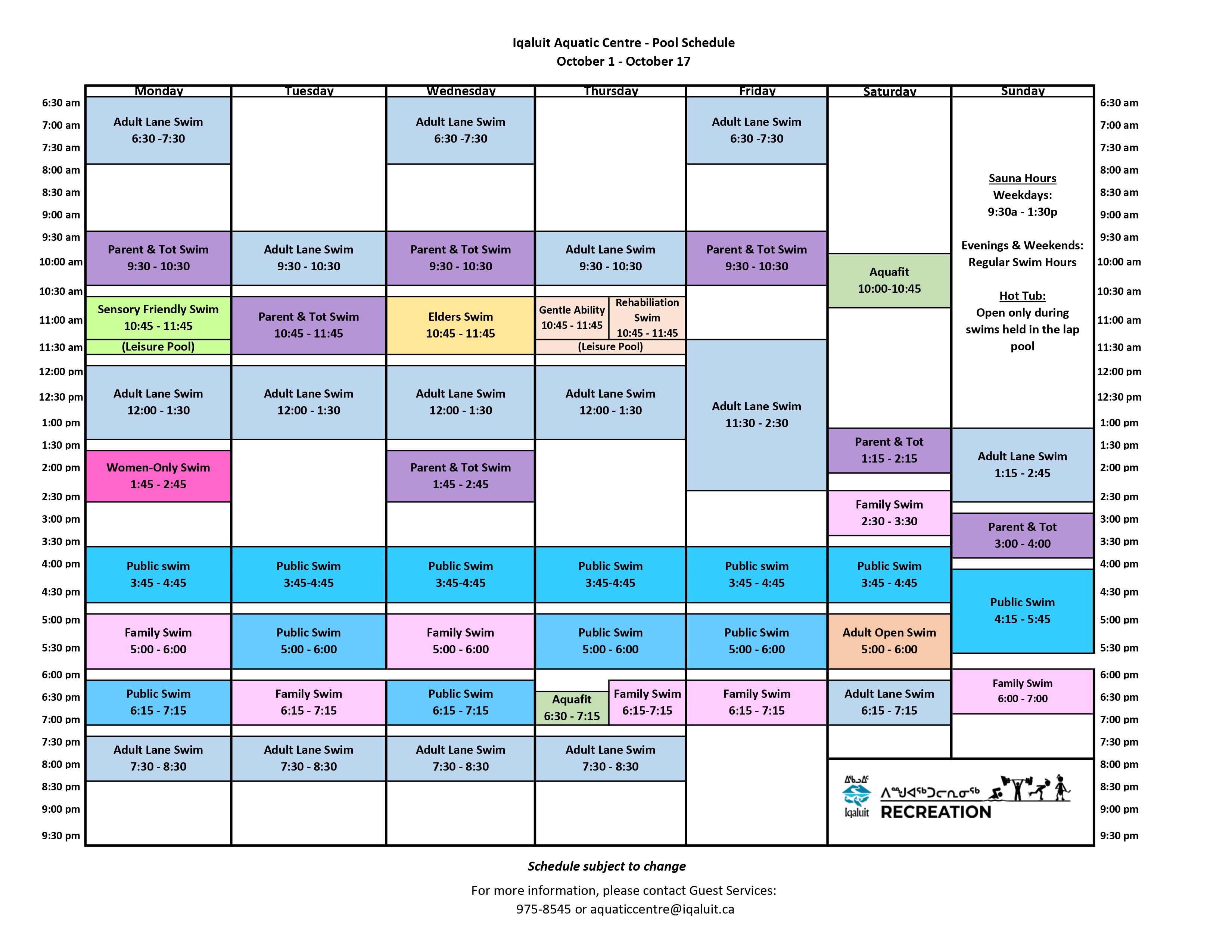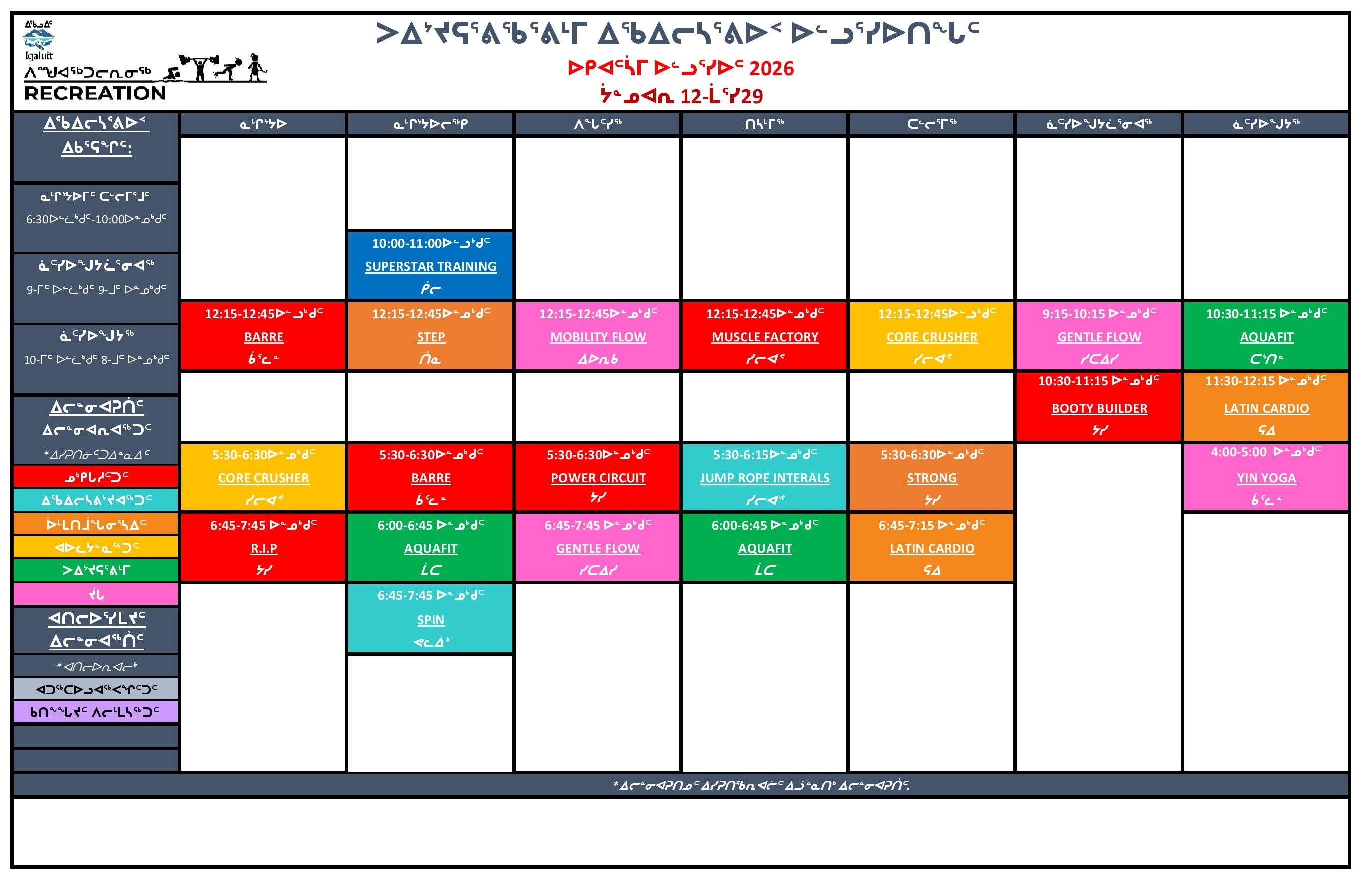 - For information on fees, click here (Pool only Inuktitut and English) or here (Fitness Inuktitut and English)