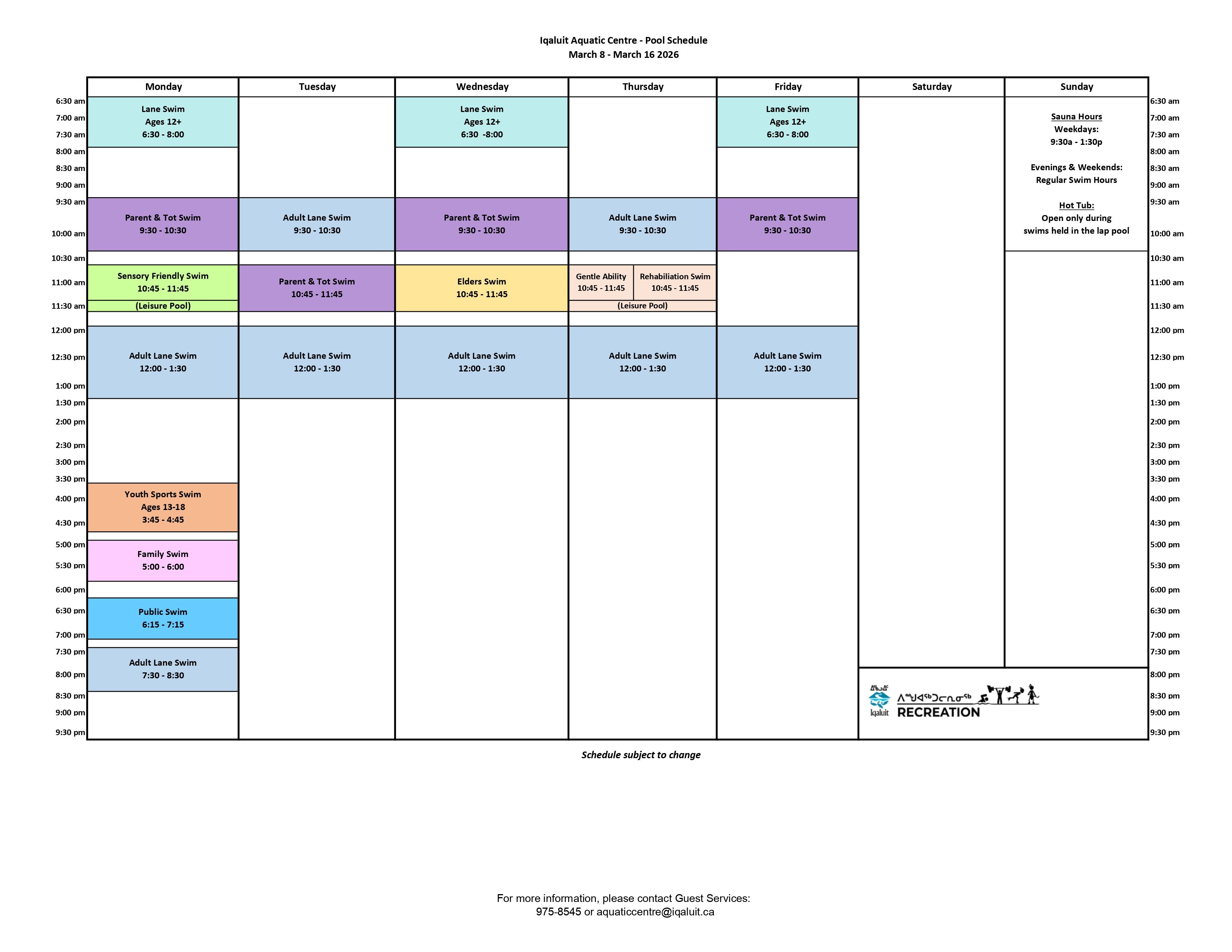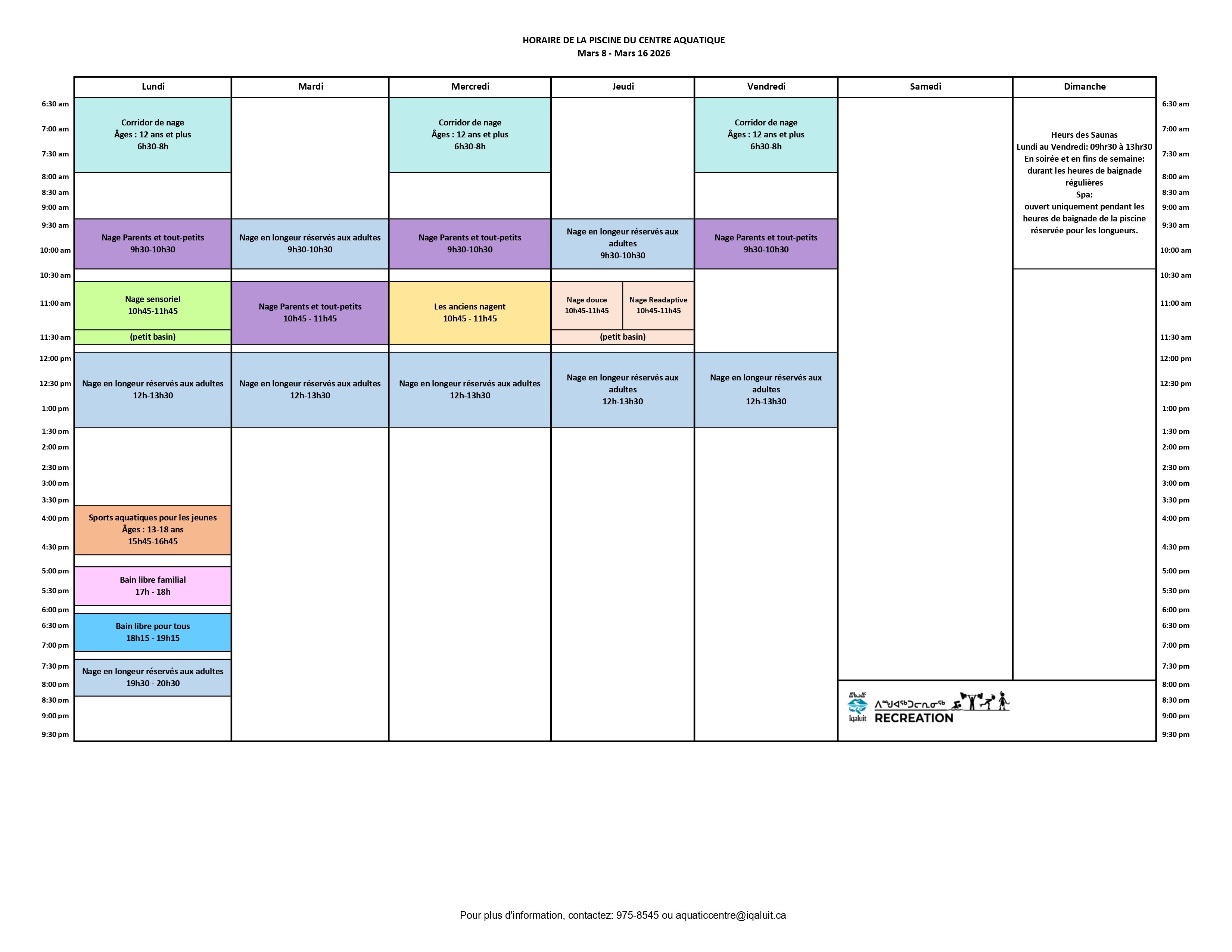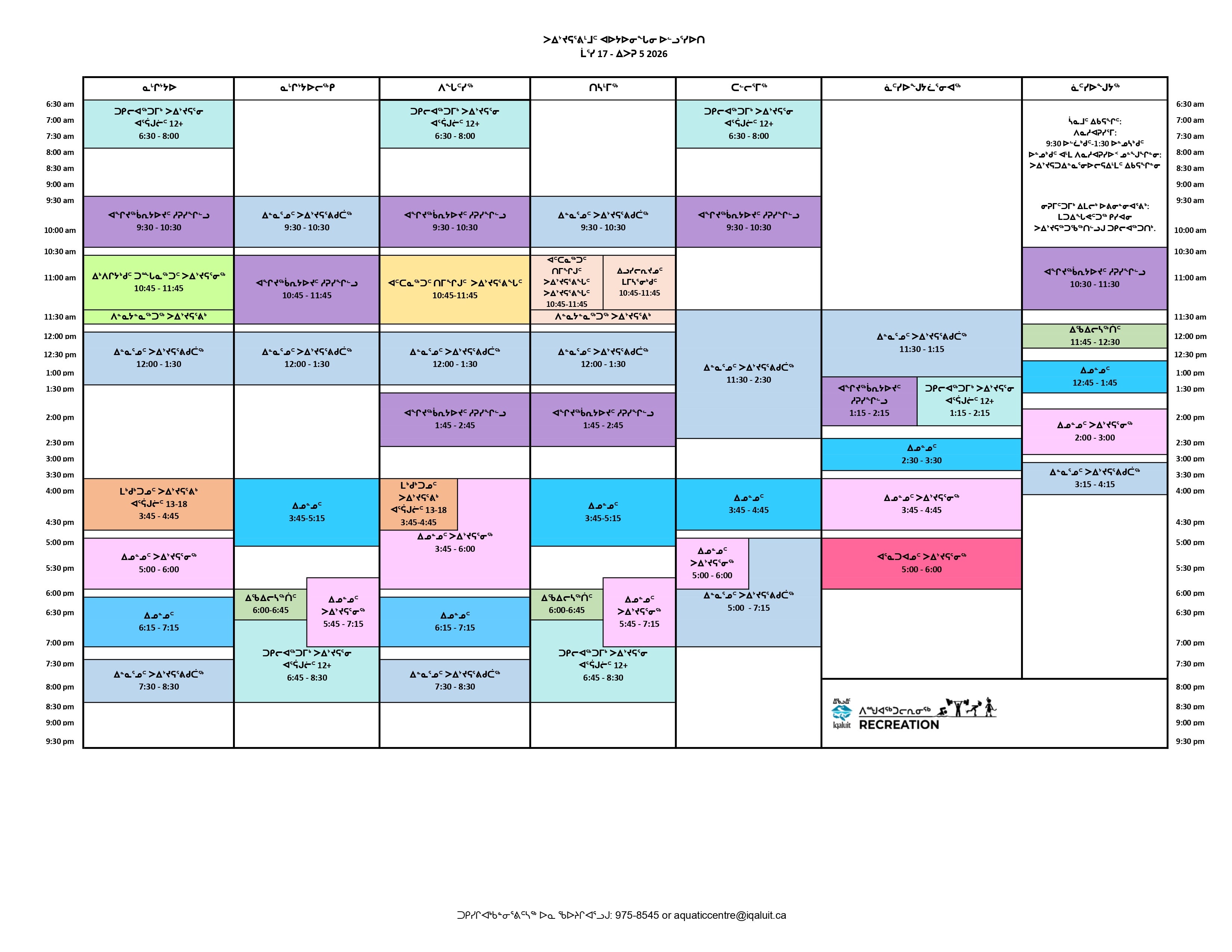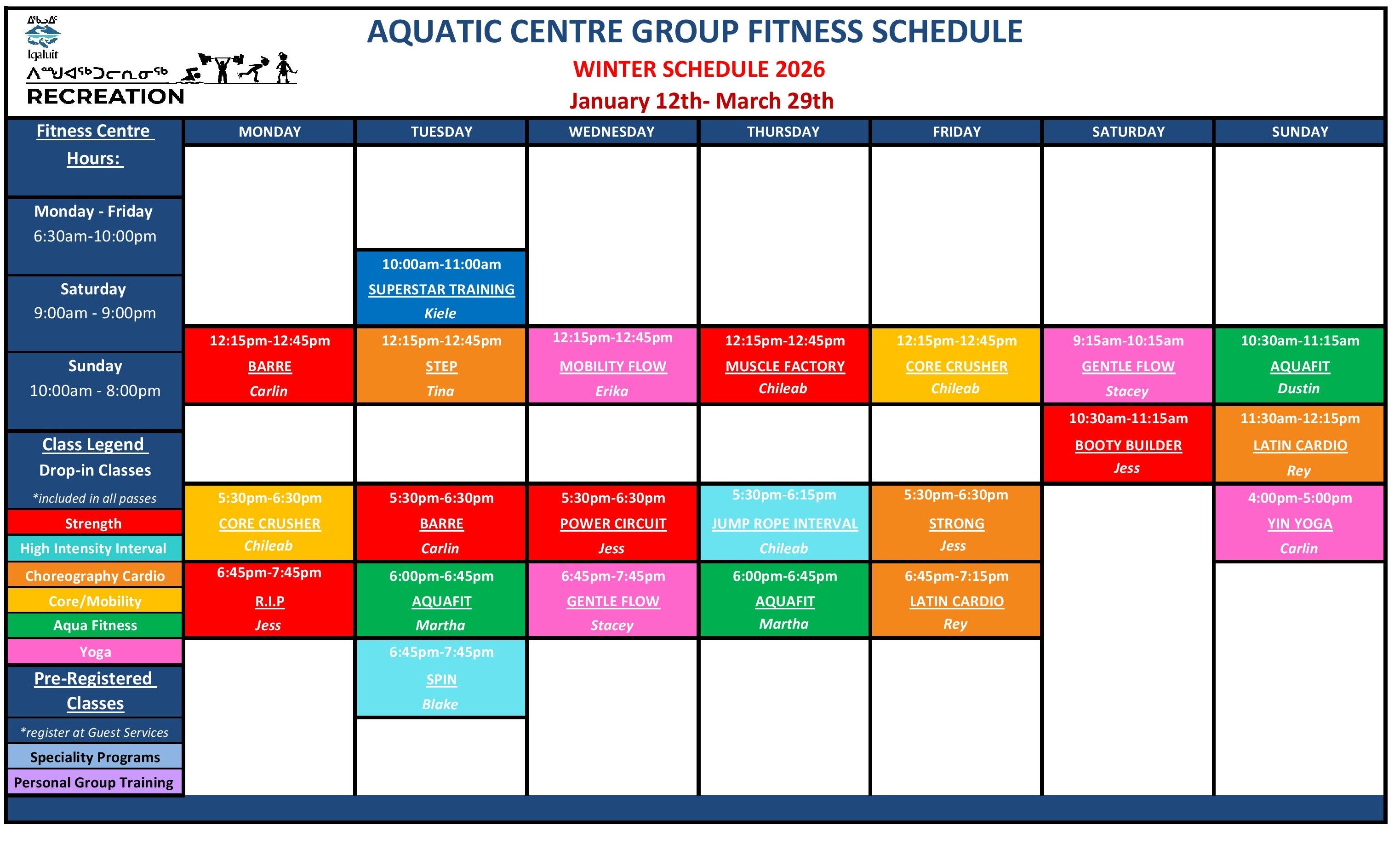 - For information on fees, click here (Pool only Inuktitut and English) or here (Fitness Inuktitut and English)